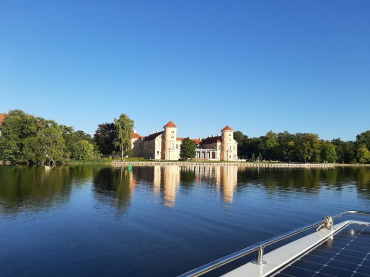 Heute soll es in die Rheinsberger Gewässer gehen. Zu Mittag wollen wir beim Fischer Gehrt in Flecken Zechlin sein. Der nur 1 m tiefe Repenter Kanal ist für die Voyager kein Problem, sie hat 60 cm Tiefgang. Andere Boote „pflügen“ da schon deutlich sichtbar durch den Modder am Grund des Kanals. Das ist weder für das jeweilige Boot noch für den Kanal und dessen tierische Bewohner zuträglich. Pünktlich zu Mittag legen wir "direkt am Tisch“ an. Ein alkoholfreies Lübzer zum Fischteller ist etwas herrliches und für den Abend wird noch Räucherfisch gebunkert. Wer weiß, wo man festmacht oder den Anker wirft. Es wurde ein Ankerplatz in einer Bucht hinter der Remusinsel im Rheinsberger See, wieder mit Sonnenuntergang gratis. Zuvor aber stand noch ein Höhepunkt an: das Rheinsberger Schloss von der Seeseite zu genießen war ein seit 20 Jahren gehegter Wunsch.