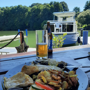 Bei herrlichstem Spätsommerwetter übernahmen wir Montag nachmittags unsere Voyager 900e „SolarLa“. Eine Einweisungsrunde raus auf die Müritz, dann ging es selbständig los. Zum ersten Mal über das „kleine Meer“ Richtung Süd-West zunächst an der Fahrrinnenbetonnung entlang, dann auf den Kirchturm Zielow zu. Von dort ging es weiter in die Kleine Müritz und dann in den Müritzarm: die Marina Buchholz war das Ziel. Bei der telefonischen Anmeldung wurde uns ein Liegeplatz zugewiesen, „den Rest machen wir morgen“ war die Ansage. Auf der Terrasse der „Seerose“ mit schönem Seeblick haben wir sehr gut gegessen.