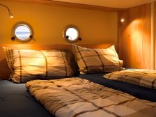 Getönte Scheiben und Vorhänge sorgen dabei für Privatsphäre. Helle Holztöne kombiniert mit blauen Polstern und Gardinen vermitteln maritimes Feeling. Darüber spannt sich der mit weiß glänzendem Material verkleidete Dachhimmel, der eine üppige Stehhöhe von fast 2m bietet. Die Möblierung ist praktisch mit dem verstellbaren Tisch, der Küchenzeile mit Induktionsherd, Spüle, Kühlschrank. Im Bug befindet sich eine große Liegefläche, von der ein Teil in Kombination mit einer pfiffigen Rücklehne auch als Sitzbank dient. Wenn man diese Fläche sieht, wird man zum Kind und möchte sofort in die gemütliche Höhle mit den freundlichen Bullaugen kriechen. Die Bullaugen mit den integrierten Mückennetzen sind übrigens sehr effektiv für die Belüftung des Bootes. Mit dem Blick zurück sieht man rechts den Durchgang zur Heckkabine mit einem fürstlichen Bett und einer ordentlichen Sitzhöhe. Auch hier sorgen vier Bullaugen für effektive Querlüftung.
