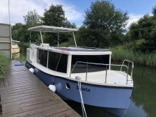 Als wir zum Bolterkanal kamen sahen wir sie schon am Steg liegen. Deutlich größer und moderner wirkte sie neben den nur 40 cm kürzeren Voyager 860. Das Solardach über dem Außendeck ist nicht nur ein Träger für vier der insgesamt 6 Solarmodule, sondern erwies sich bei dem traumhaften Spätsommerwetter auch als angenehmer Sonnenschutz. Der Niedergang vom Achterdeck zur Kajüte ist in der Art einer Raumspartreppe mit unterschiedlich tiefen Stufen ausgebildet und lässt sich hervorragend begehen. Hell, freundlich und luftig wirkt die Kajüte mit den großen Fensterflächen.