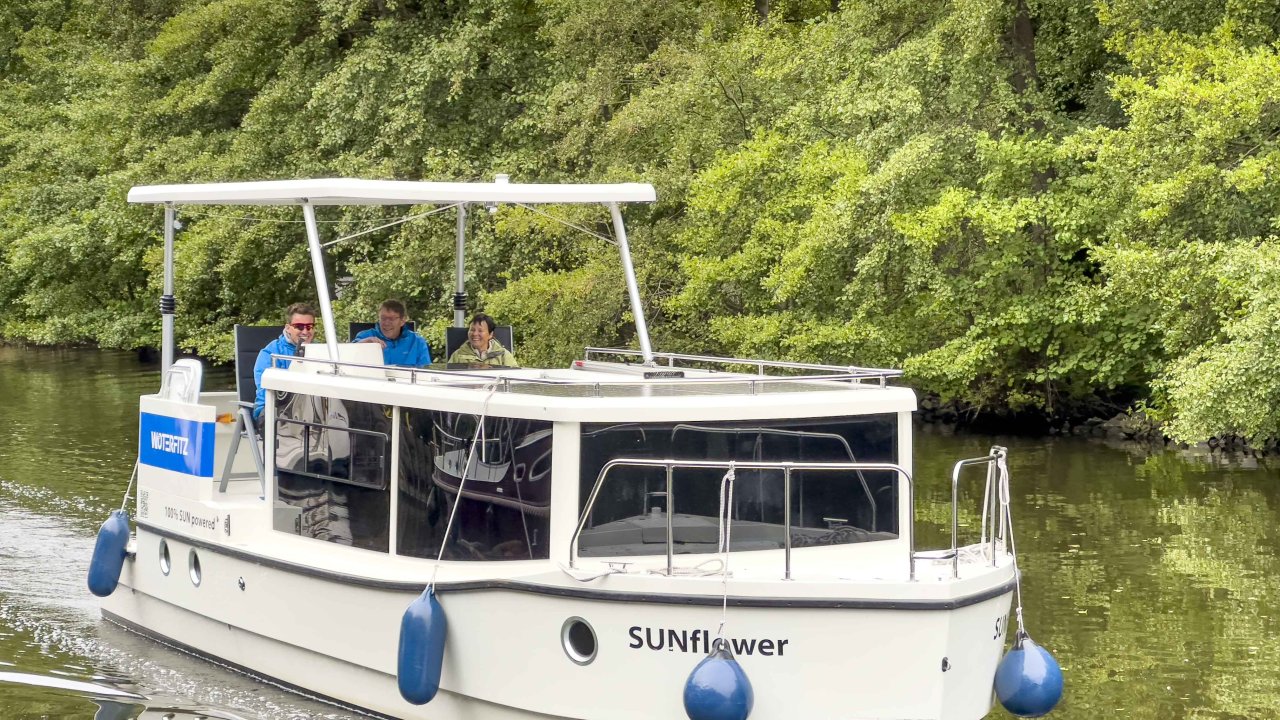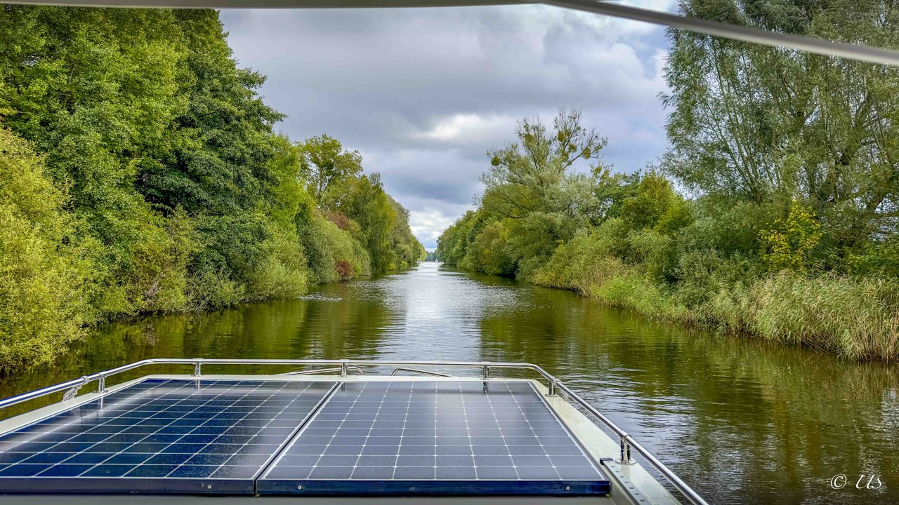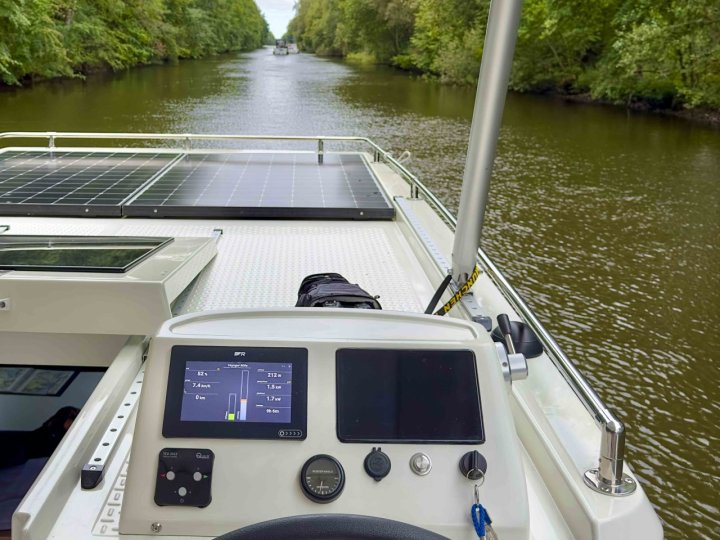 Und der hat mich wirklich erstaunt: Wir sind meist mit 6-8 km/h lautlos durchs Wasser geglitten und dabei hatte der Motor eine Leistungsaufnahme von ca. 1500 - 2000 Watt - so viel wie ein Heizlüfter. Die Hydrodynamik des Bootes ist einzigartig. Für einen Neuling klingt das etwas langsam aber es ist die typische Geschwindigkeit der meisten Verdrängerboote in dieser Größe. Ohnehin darf man auf den Kanälen nicht schneller als 9 km/h fahren.